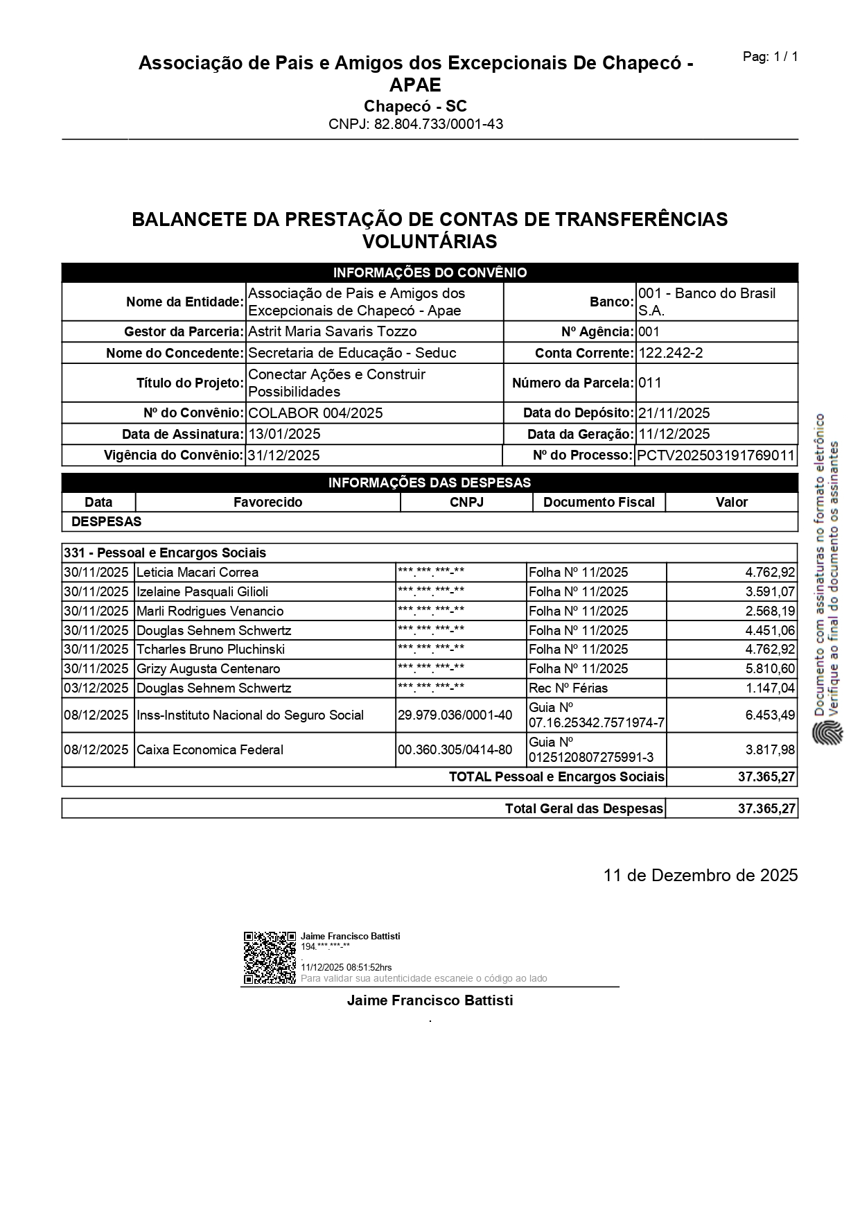 11ª parcela no valor de R$ 40.329,00 (Quarenta mil, trezentos e vinte e nove reais) liberada em 21/11/2025.