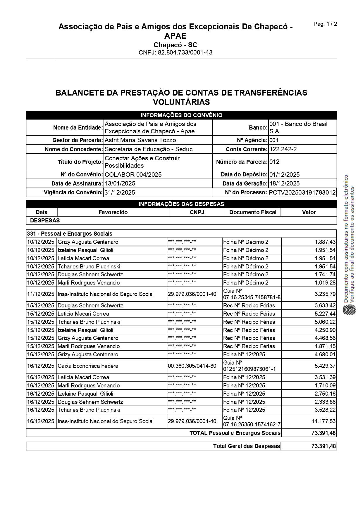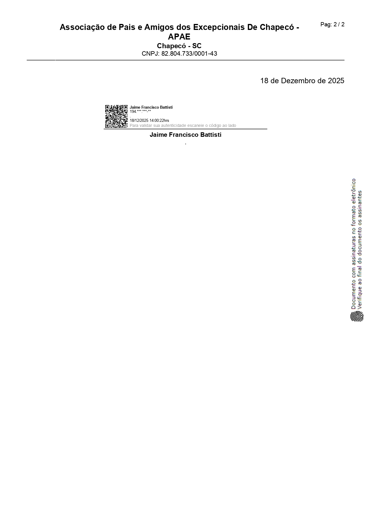 A Associação de Pais e Amigos dos Excepcionais firmou com a Prefeitura Municipal de Chapecó, o termo de Colaboração nº 004/2025 cujo objeto é oferecer atendimento pedagógico especializado para estudantes/ crianças/famílias com atraso no desenvolvimento neuropsicomotor – DNPM, deficiência intelectual, transtorno do espectro autista – TEA ou que estejam em processo de investigação, matriculados (as) na rede municipal de ensino de Chapecó e disponibilizar assessoria e formações especializadas acerca destes (as) mesmos (as) estudantes/ crianças para os professores da rede municipal e seus familiares na Associação de Pais e Amigos dos Excepcionais APAE Chapecó.