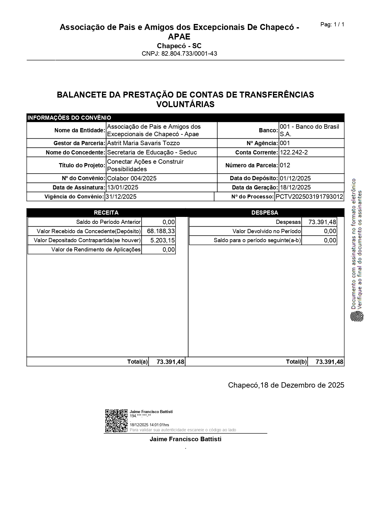 12ª parcela no valor de R$ 68.188,33 (Sessenta e oito mil, cento e oitenta e oito reais e trinta e três centavos) liberada em 01/12/2025.