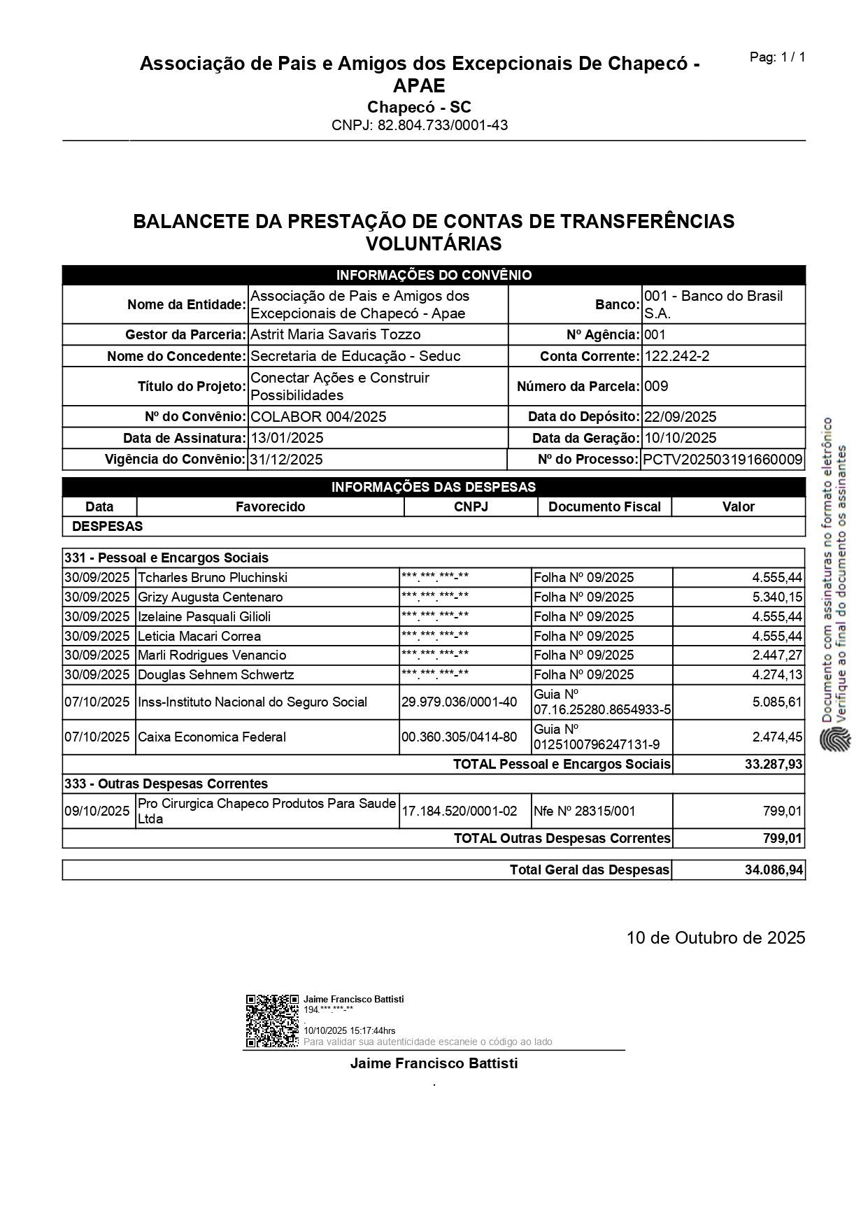 A Associação de Pais e Amigos dos Excepcionais firmou com a Prefeitura Municipal de Chapecó, o termo de Colaboração nº 004/2025 cujo objeto é oferecer atendimento pedagógico especializado para estudantes/ crianças/famílias com atraso no desenvolvimento neuropsicomotor – DNPM, deficiência intelectual, transtorno do espectro autista – TEA ou que estejam em processo de investigação, matriculados (as) na rede municipal de ensino de Chapecó e disponibilizar assessoria e formações especializadas acerca destes (as) mesmos (as) estudantes/ crianças para os professores da rede municipal e seus familiares na Associação de Pais e Amigos dos Excepcionais APAE Chapecó.