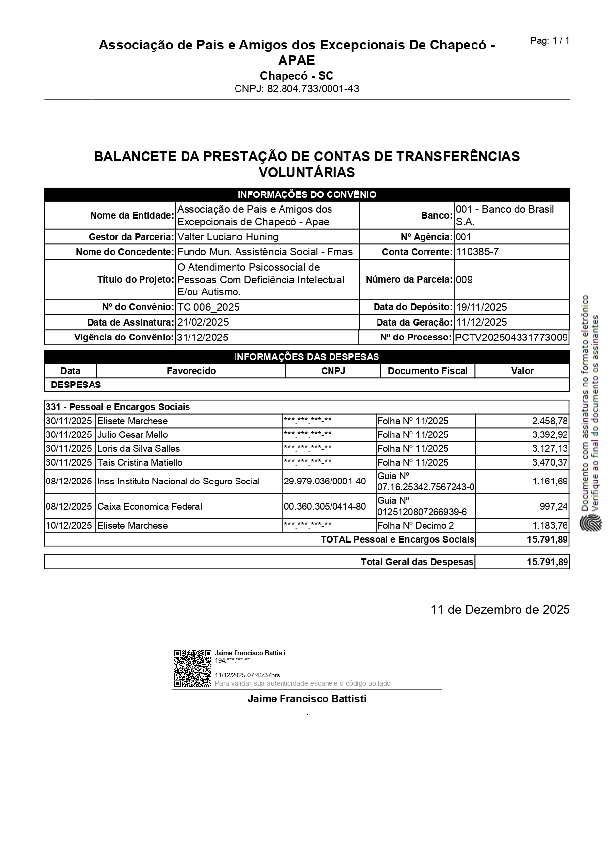 A Associação de Pais e Amigos dos Excepcionais firmou com a Prefeitura Municipal de Chapecó, o Termo de Colaboração nº 006/2025, cujo objeto é Atender pessoas com atraso no desenvolvimento neuropsicomotor, com deficiência intelectual e/ou múltipla e com transtorno do espectro autista matriculadas na APAE e suas famílias, visando o fortalecimento de vínculos; o acesso a benefícios, programas e serviços da rede socioassistencial; a prevenção de agravos nas deficiências, prevenção ao acolhimento institucional; desenvolvimento de habilidades e potencialidades e melhoria da qualidade de vida.