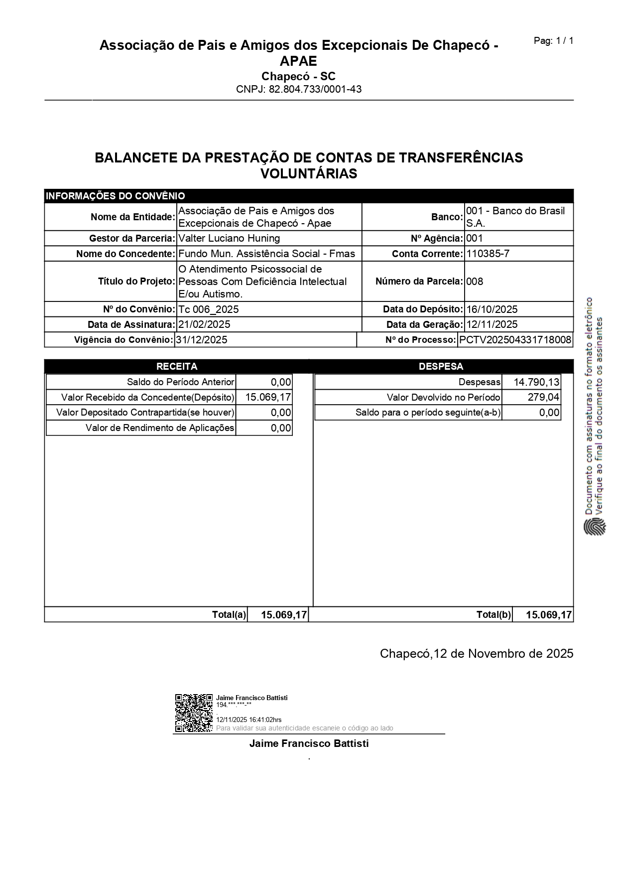8ª parcela no valor de R$ 15.069,17 (quinze mil e sessenta e nove reais e dezessete centavos) liberada em 16/10/2025.