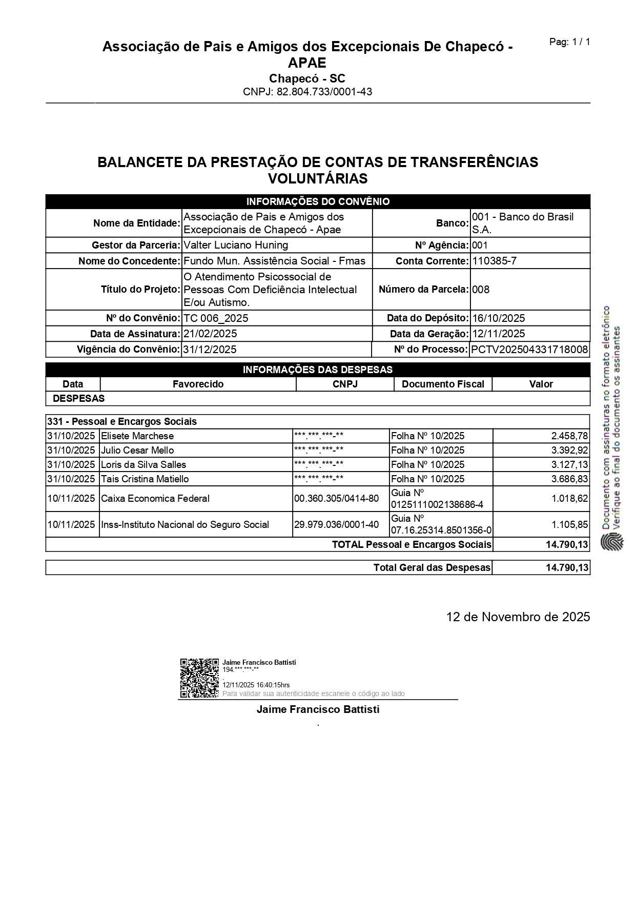A Associação de Pais e Amigos dos Excepcionais firmou com a Prefeitura Municipal de Chapecó, o Termo de Colaboração nº 006/2025, cujo objeto é Atender pessoas com atraso no desenvolvimento neuropsicomotor, com deficiência intelectual e/ou múltipla e com transtorno do espectro autista matriculadas na APAE e suas famílias, visando o fortalecimento de vínculos; o acesso a benefícios, programas e serviços da rede socioassistencial; a prevenção de agravos nas deficiências, prevenção ao acolhimento institucional; desenvolvimento de habilidades e potencialidades e melhoria da qualidade de vida.