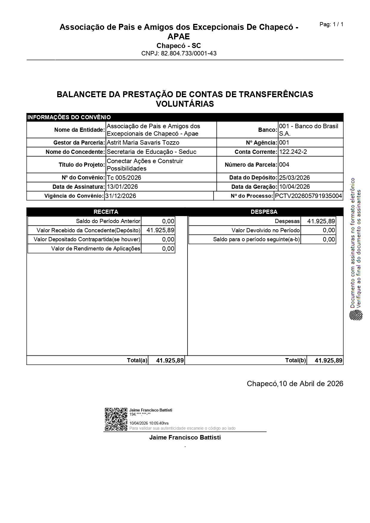 Associação de Pais e Amigos dos Excepcionais firmou com a Prefeitura Municipal de Chapecó, o termo de Colaboração nº 005/2026 cujo objeto é oferecer atendimento pedagógico especializado para estudantes/ crianças/famílias com atraso no desenvolvimento neuropsicomotor – DNPM, deficiência intelectual, transtorno do espectro autista – TEA ou que estejam em processo de investigação, matriculados (as) na rede municipal de ensino de Chapecó e disponibilizar assessoria e formações especializadas acerca destes (as) mesmos (as) estudantes/ crianças para os professores da rede municipal e seus familiares na Associação de Pais e Amigos dos Excepcionais APAE Chapecó.