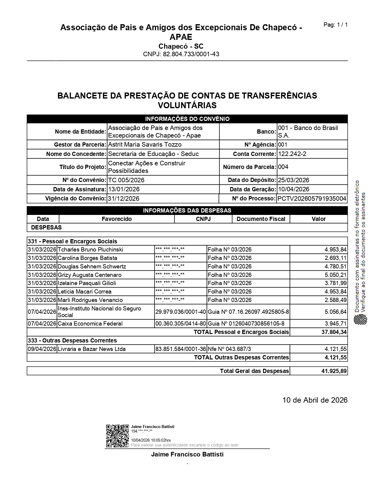 3ª parcela no valor de R$ 41.925,89 (Quarenta e um mil novecentos e vinte e cinco reais e oitenta e nove centavos) liberada em 23/03/2026.