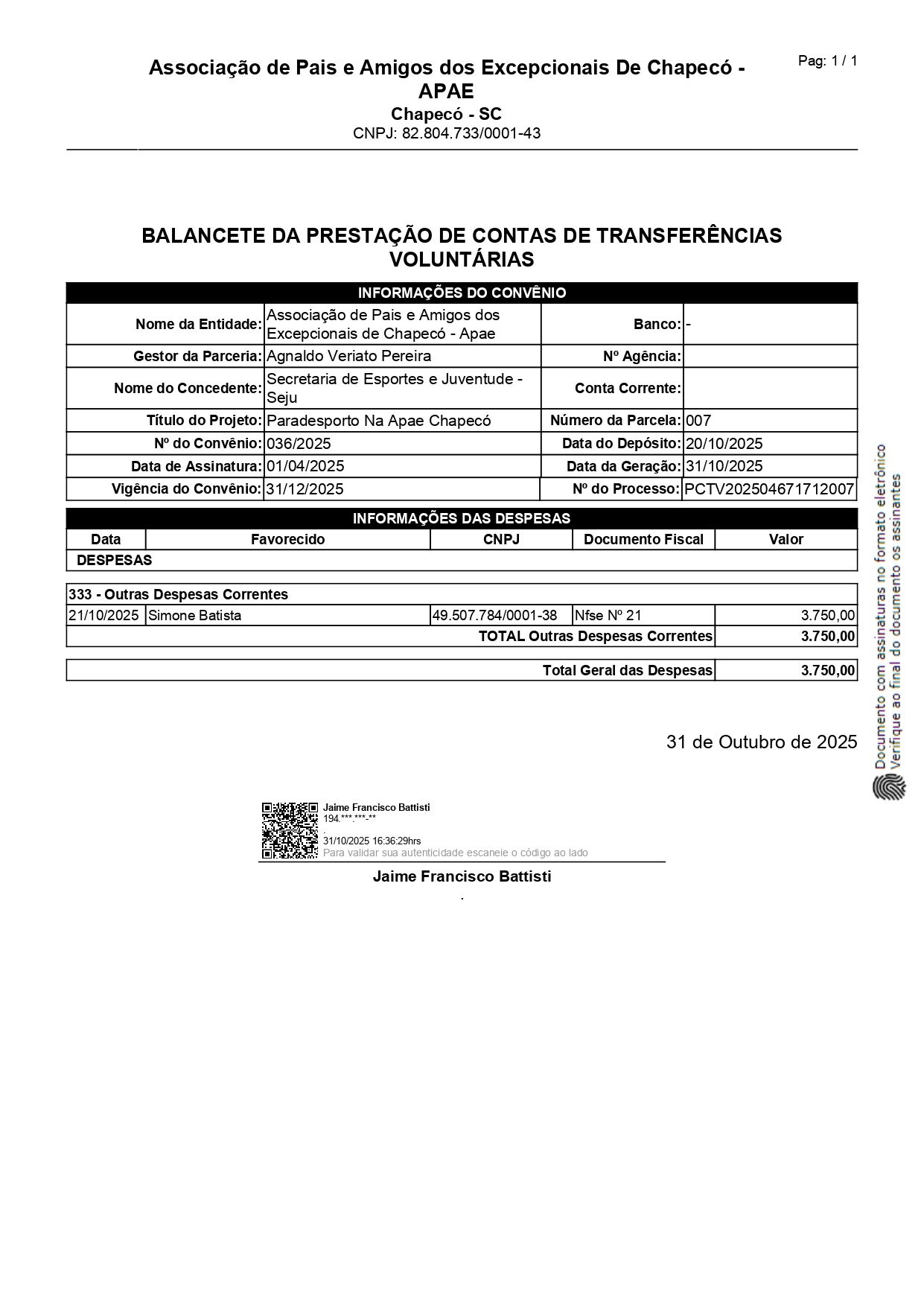 A Associação de Pais e Amigos dos Excepcionais firmou com a Prefeitura Municipal de Chapecó, o termo de Colaboração nº 036/2025, cujo objeto é promover e desenvolver o paradesporto na APAE Chapecó, além de realizar treinamento das atividades paradesportivas, promover integração entre usuários/atletas da entidade, democratizar o acesso a prática e cultura do esporte de forma a promover o desenvolvimento integral dos usuários como fator de formação da cidadania e melhoria na qualidade de vida dos mesmos.